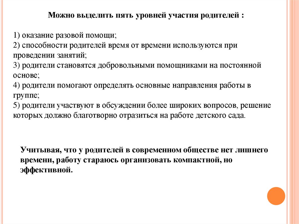 Можно выделить пять уровней участия родителей :1) оказание разовой помощи;