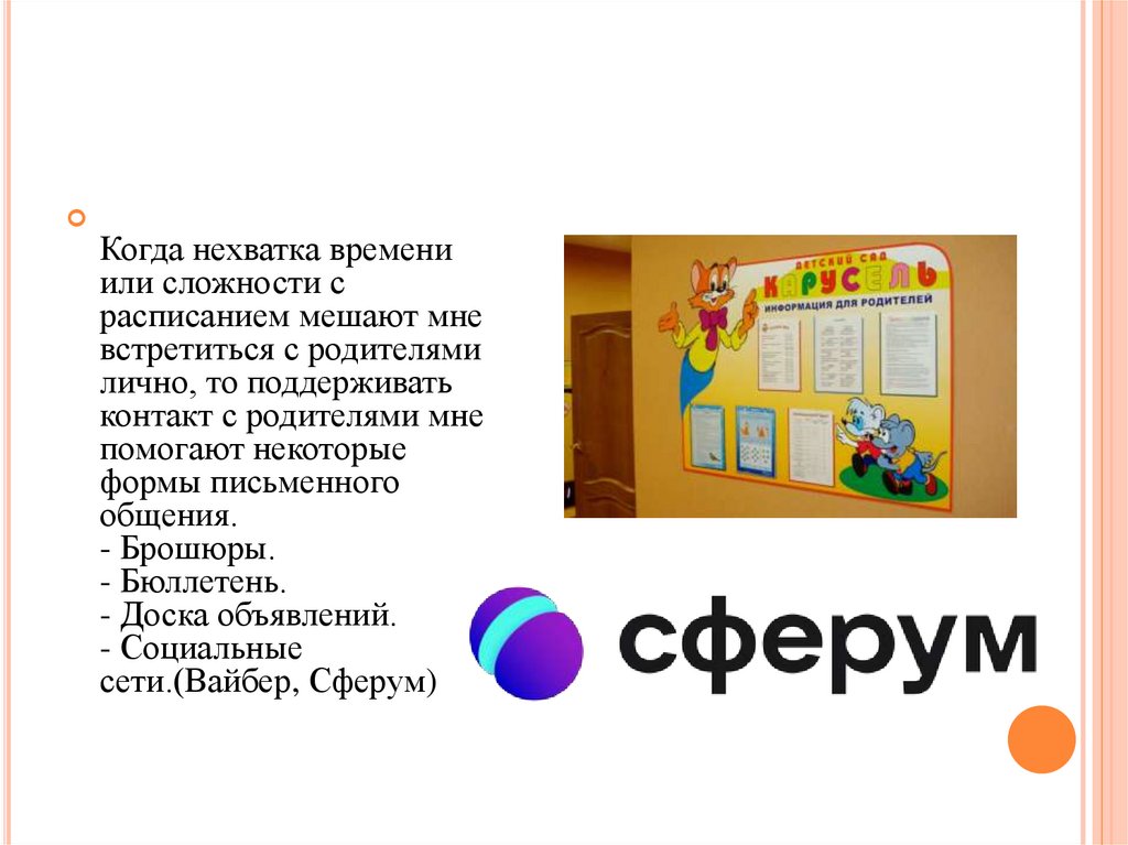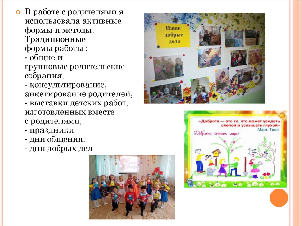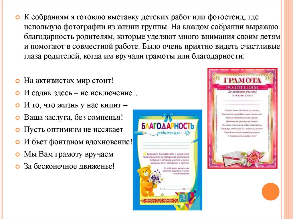 К собраниям я готовлю выставку детских работ или фотостенд, гдеиспользую фотографии из жизни группы. На каждом собрании выражаю