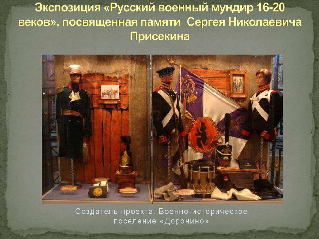 1. Экспозиция «Русский военный мундир 16-20 веков», посвященная памяти Сергея Николаевича Присекина