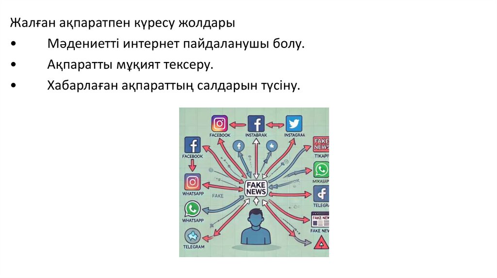 • Жалған ақпараттың таралу жолдарыӘлеуметтік желілер: Facebook, Instagram, TikTok және т.б.
