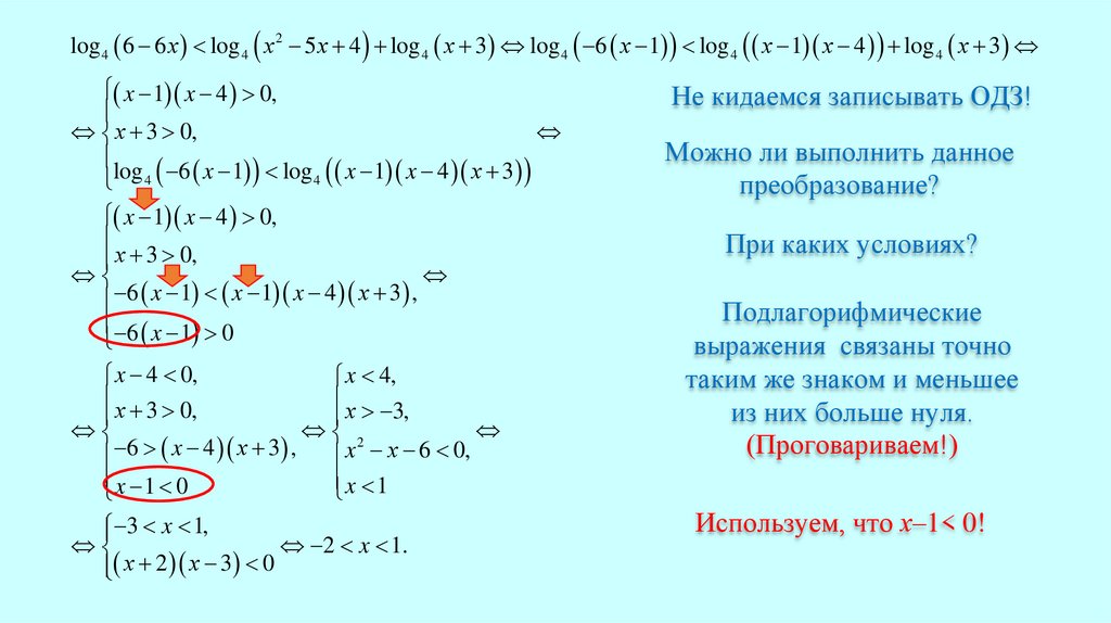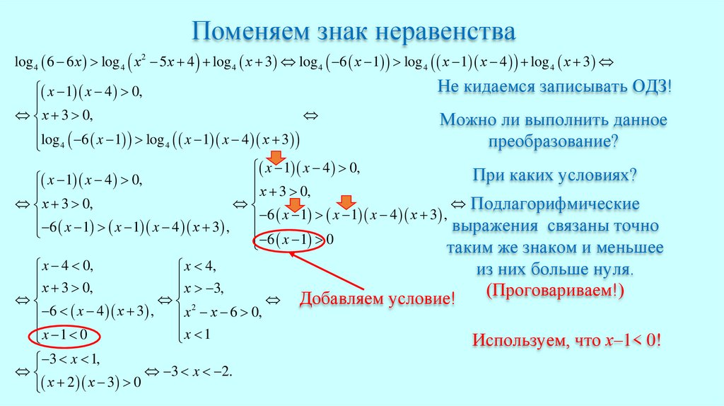 Поменяем знак неравенстваlog 4 6 6 х log 4 x 2 5 х 4 log 4 х 3 log 4 6 x 1 log 4 x 1 x 4 log 4 х 3