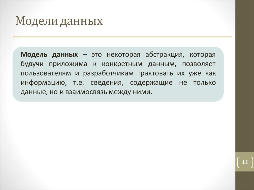 Модели данныхМодель данных – это некоторая абстракция, которая