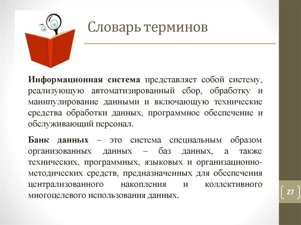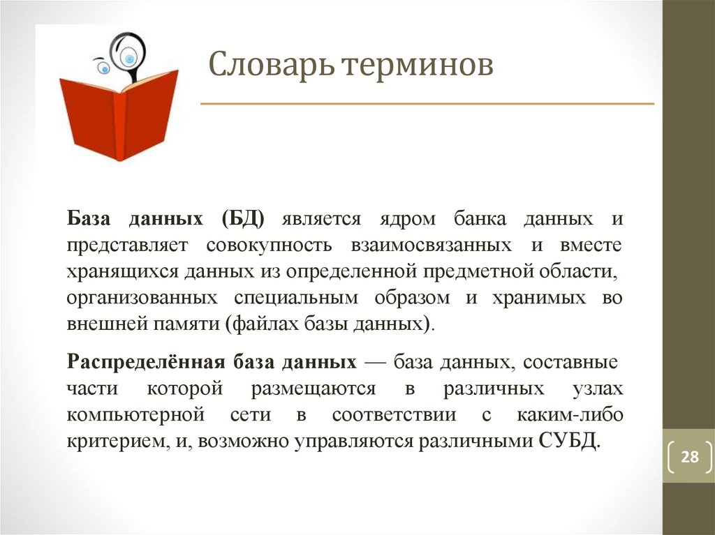 Словарь терминовБаза данных (БД) является ядром банка данных и