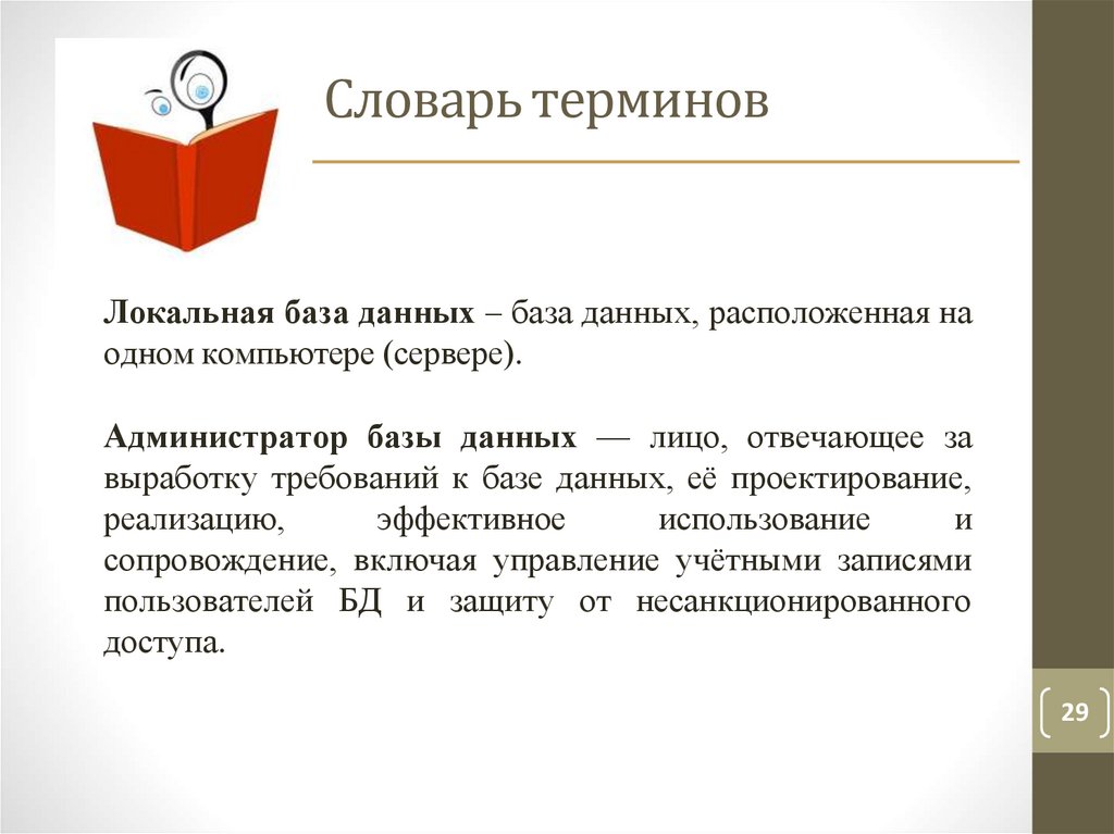 Словарь терминовЛокальная база данных – база данных, расположенная на
