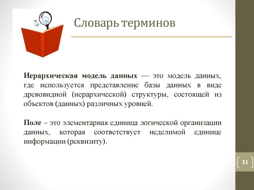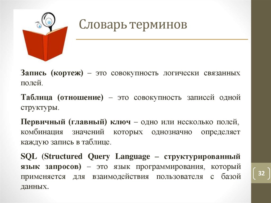 Словарь терминовЗапись (кортеж) – это совокупность логически связанных