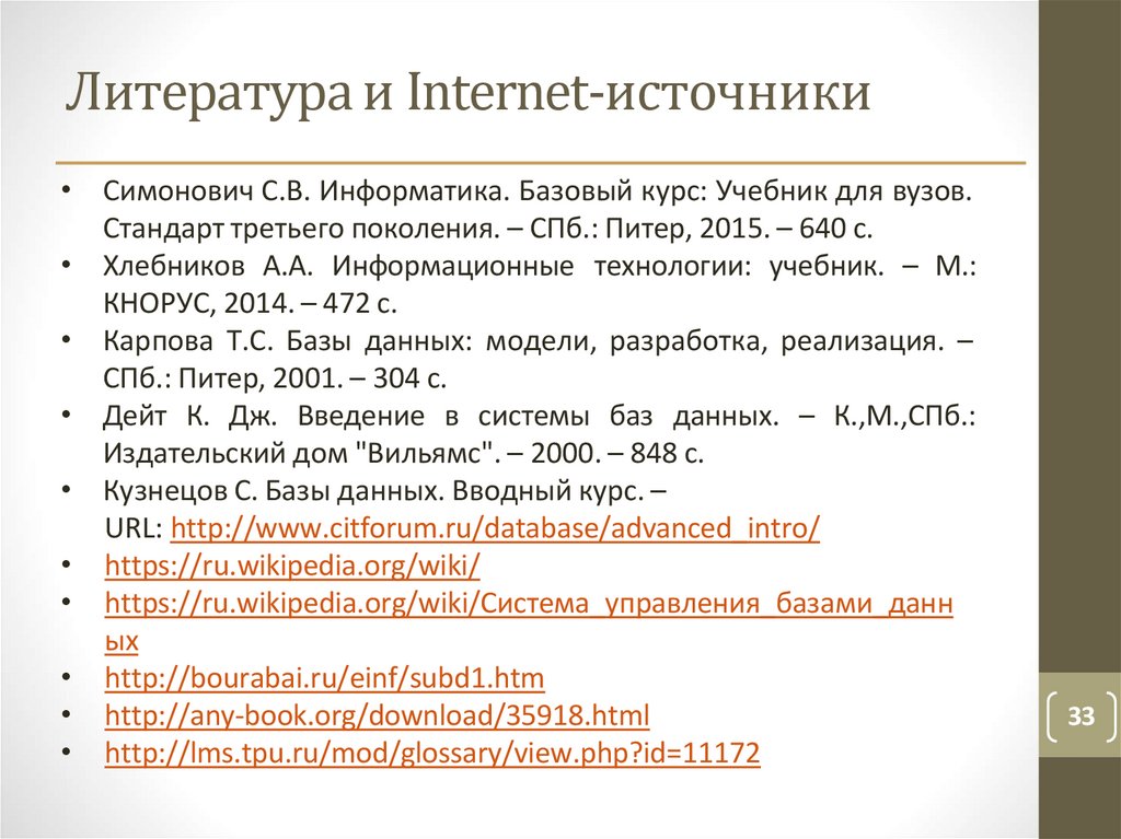 Литература и Internet-источники• Симонович С.В. Информатика. Базовый курс: Учебник для вузов.
