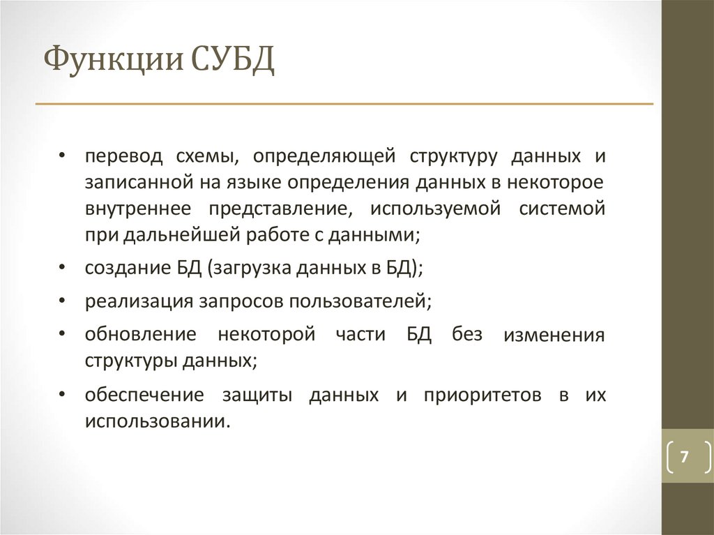 Функции СУБД• перевод схемы, определяющей структуру данных и