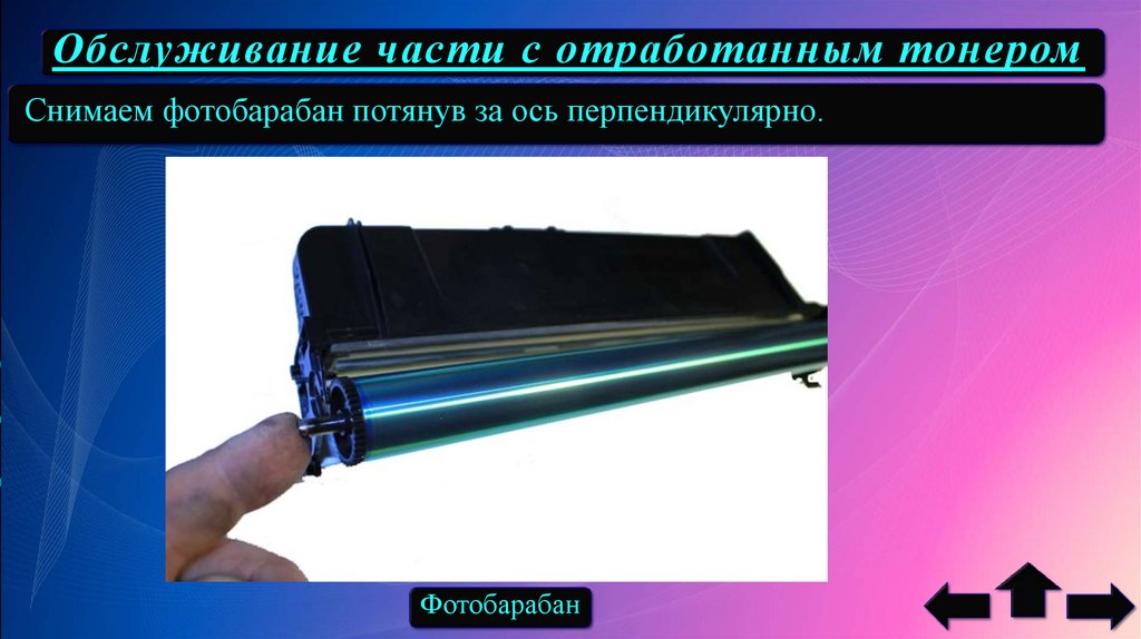 Обслуживание части с отработанным тонеромСнимаем фотобарабан потянув за ось перпендикулярно.