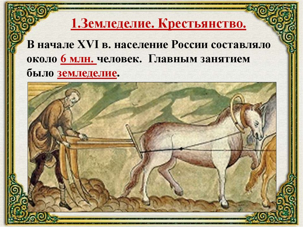 1.Земледелие. Крестьянство.В начале XVI в. население России составляло