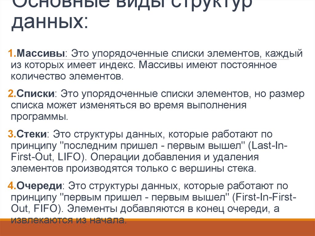 1.Массивы: Это упорядоченные списки элементов, каждыйиз которых имеет индекс. Массивы имеют постоянное