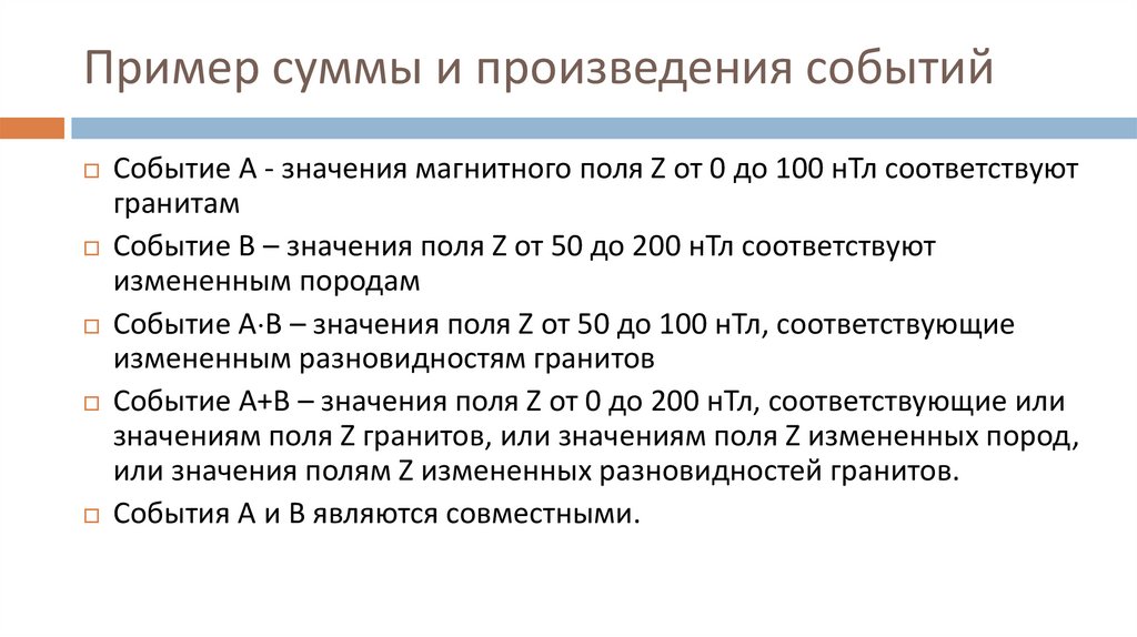 Пример суммы и произведения событийСобытие А - значения магнитного поля Z от 0 до 100 нТл соответствуют