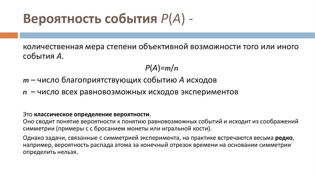 Вероятность события Р(А) количественная мера степени объективной возможности того или иногособытия А.