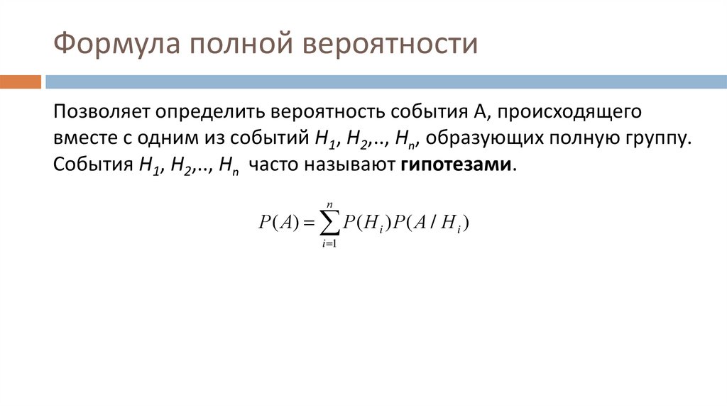Формула полной вероятностиПозволяет определить вероятность события А, происходящего