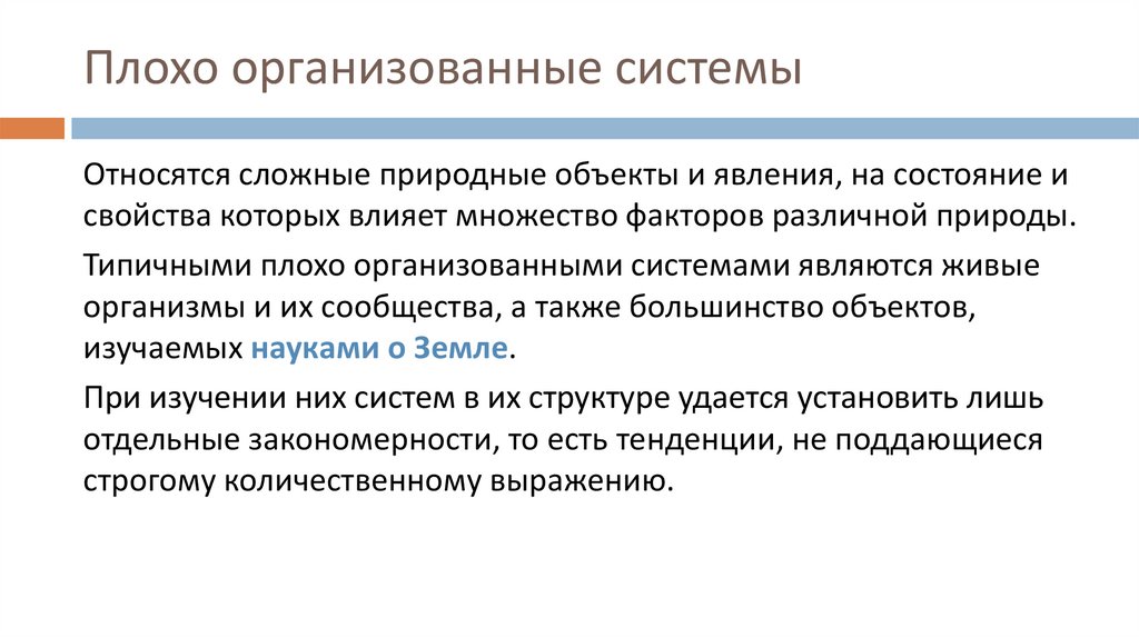 Плохо организованные системыОтносятся сложные природные объекты и явления, на состояние и