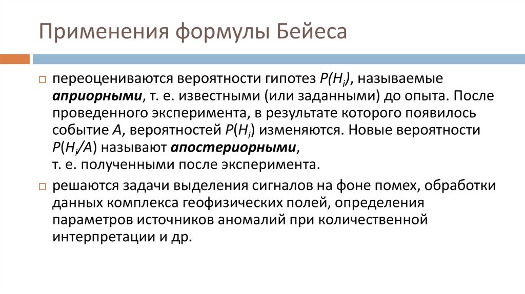 Применения формулы Бейесапереоцениваются вероятности гипотез Р(Hi), называемые