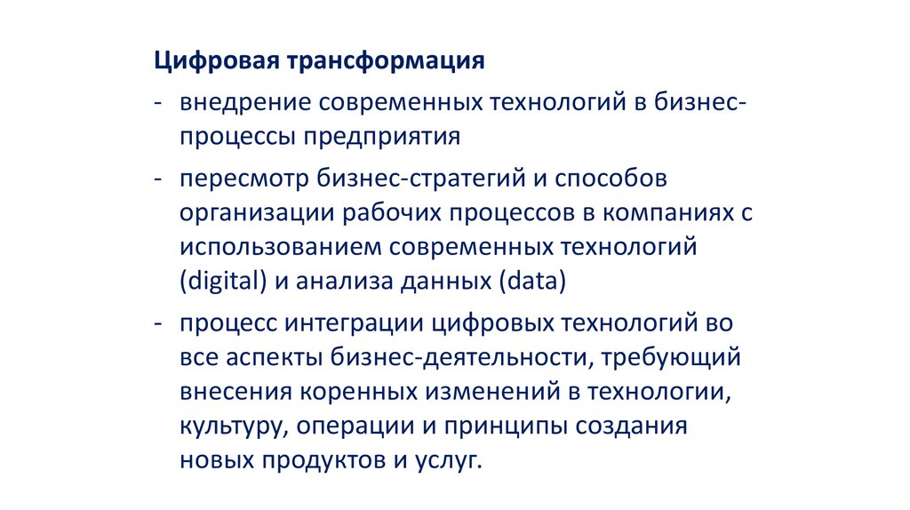 Цифровая трансформация- внедрение современных технологий в бизнеспроцессы предприятия