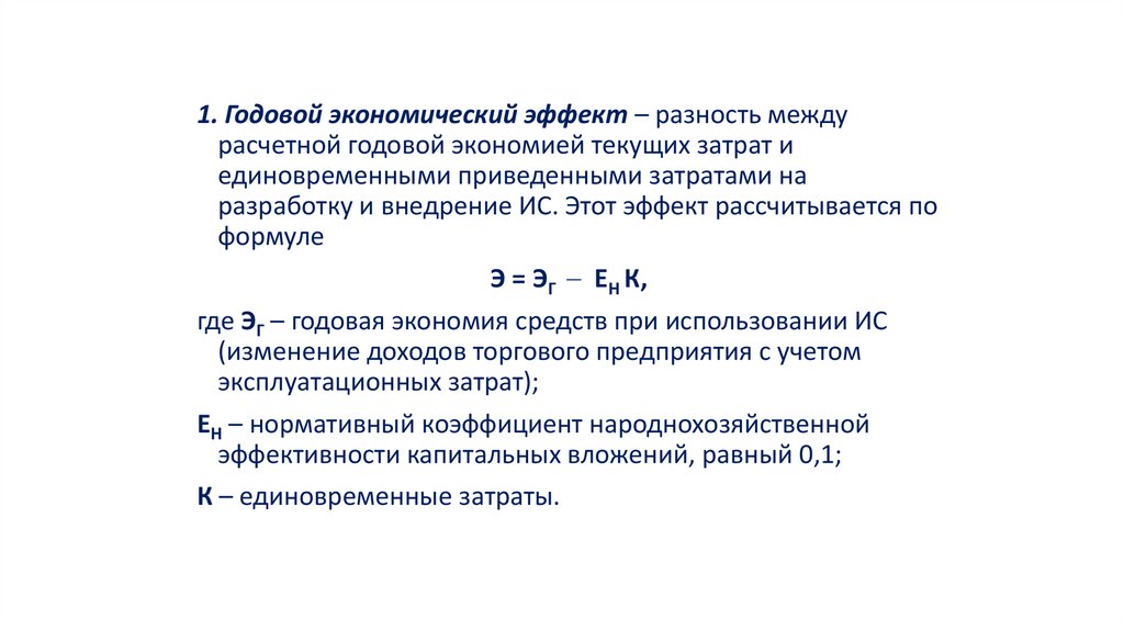 1. Годовой экономический эффект – разность междурасчетной годовой экономией текущих затрат и
