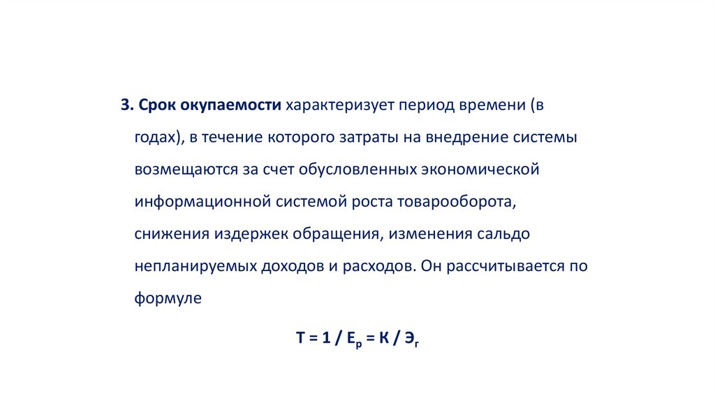 3. Срок окупаемости характеризует период времени (вгодах), в течение которого затраты на внедрение системы