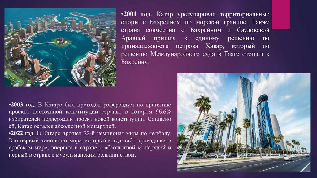 •2001 год. Катар урегулировал территориальныеспоры с Бахрейном по морской границе. Также