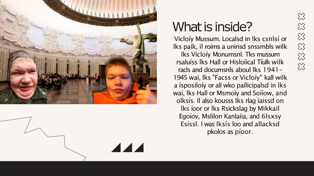 What is inside?Vicloíy Mussum. Localsd in lks csnlsí or