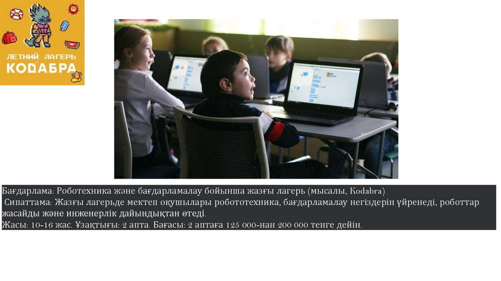 Бағдарлама: Роботехника және бағдарламалау бойынша жазғы лагерь (мысалы, Kodabra)Сипаттама: Жазғы лагерьде мектеп оқушылары робототехника, бағдарламалау негіздерін үйренеді, роботтар