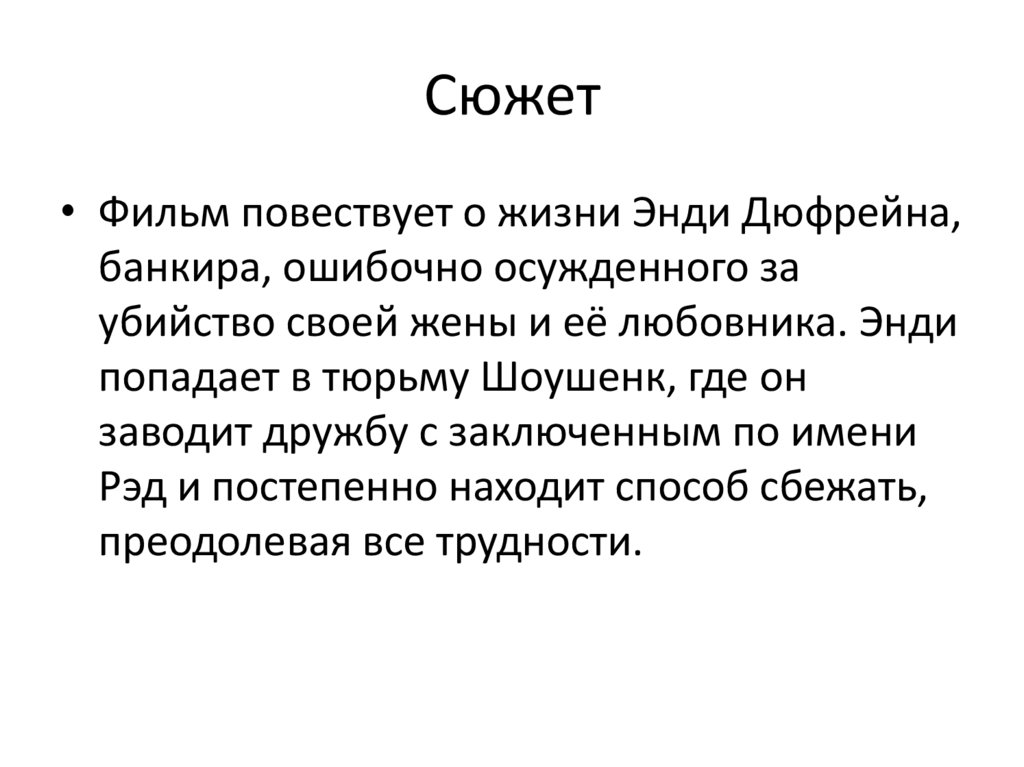Сюжет• Фильм повествует о жизни Энди Дюфрейна,