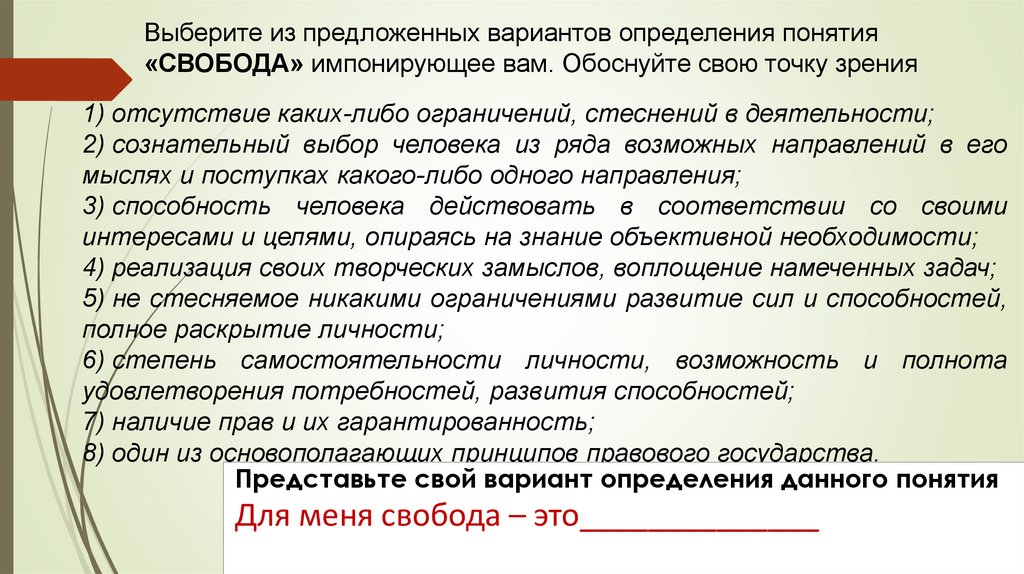 Выберите из предложенных вариантов определения понятия«СВОБОДА» импонирующее вам. Обоснуйте свою точку зрения