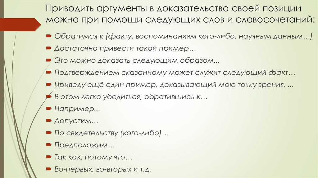 Приводить аргументы в доказательство своей позицииможно при помощи следующих слов и словосочетаний: