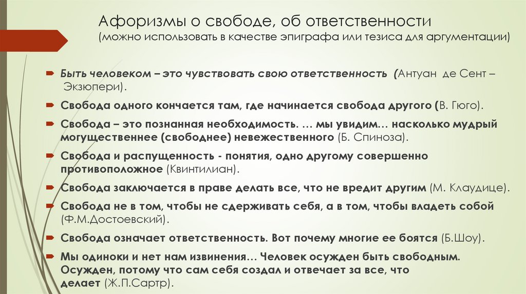 Афоризмы о свободе, об ответственности(можно использовать в качестве эпиграфа или тезиса для аргументации)