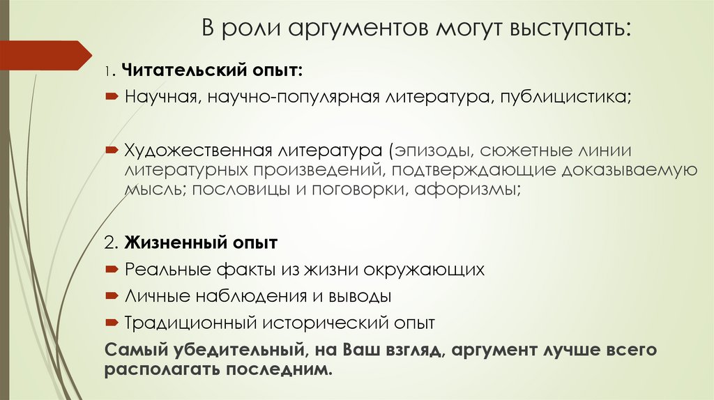 В роли аргументов могут выступать:1. Читательский опыт: