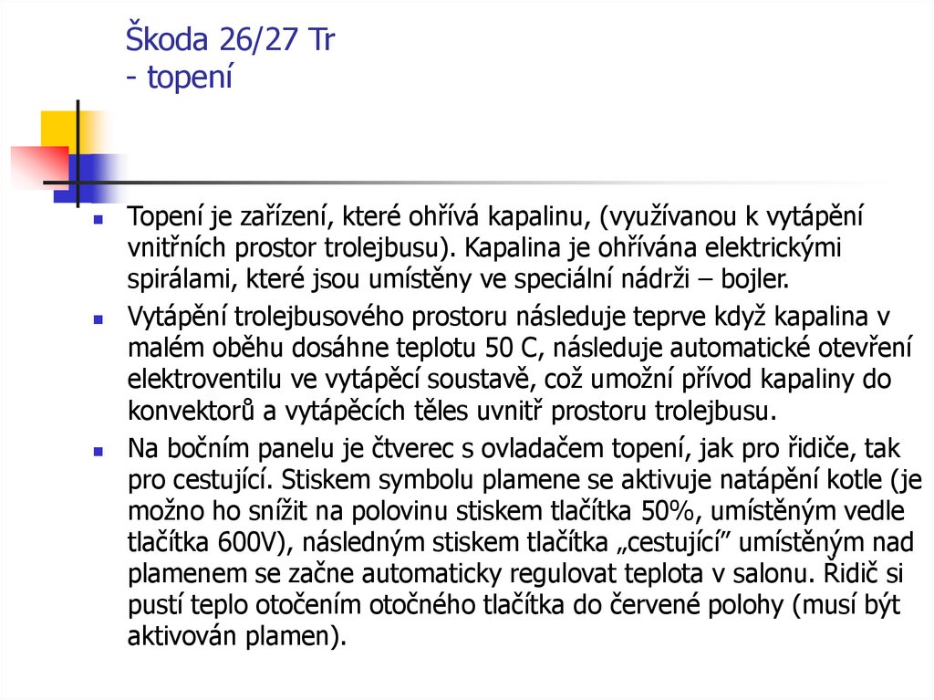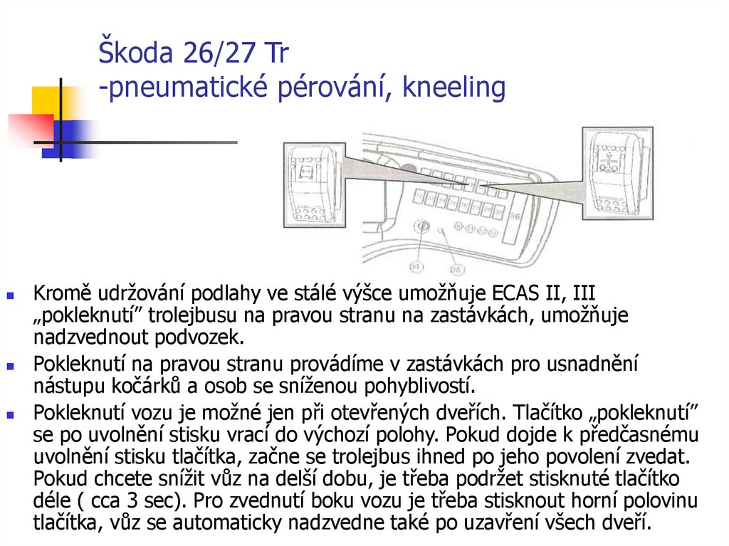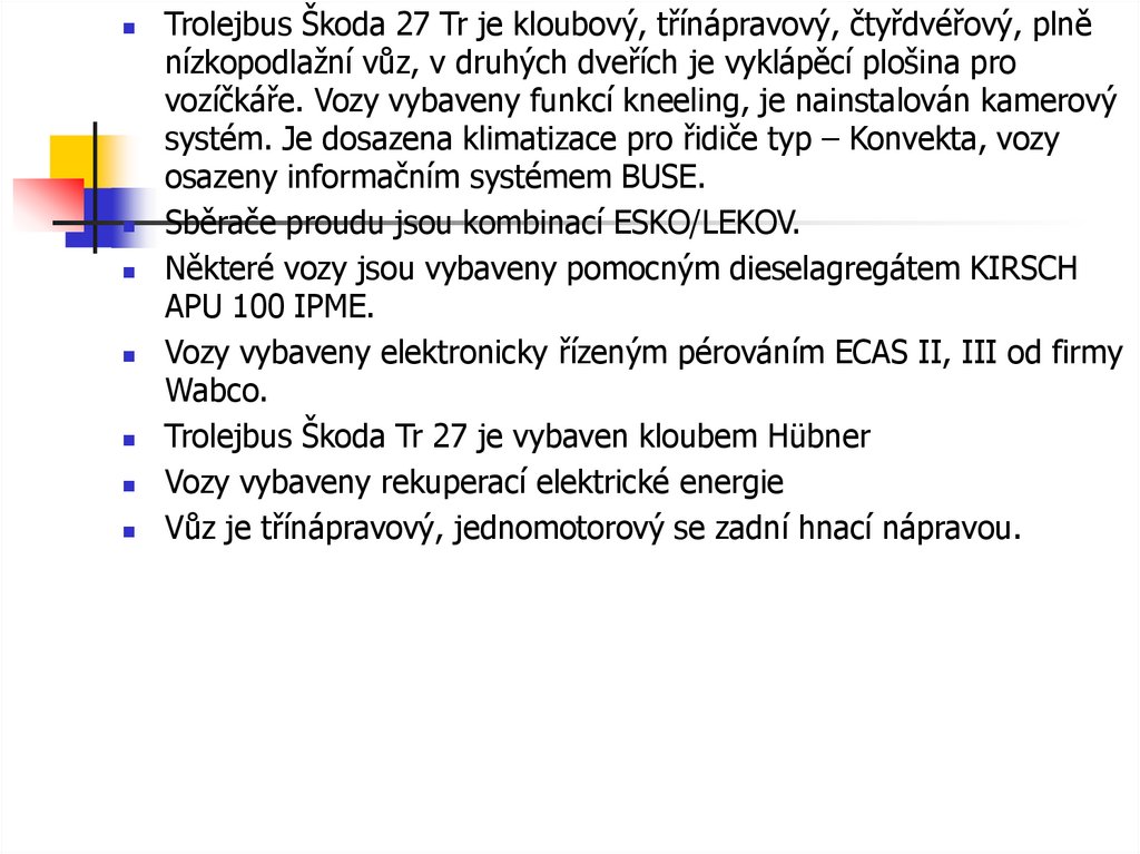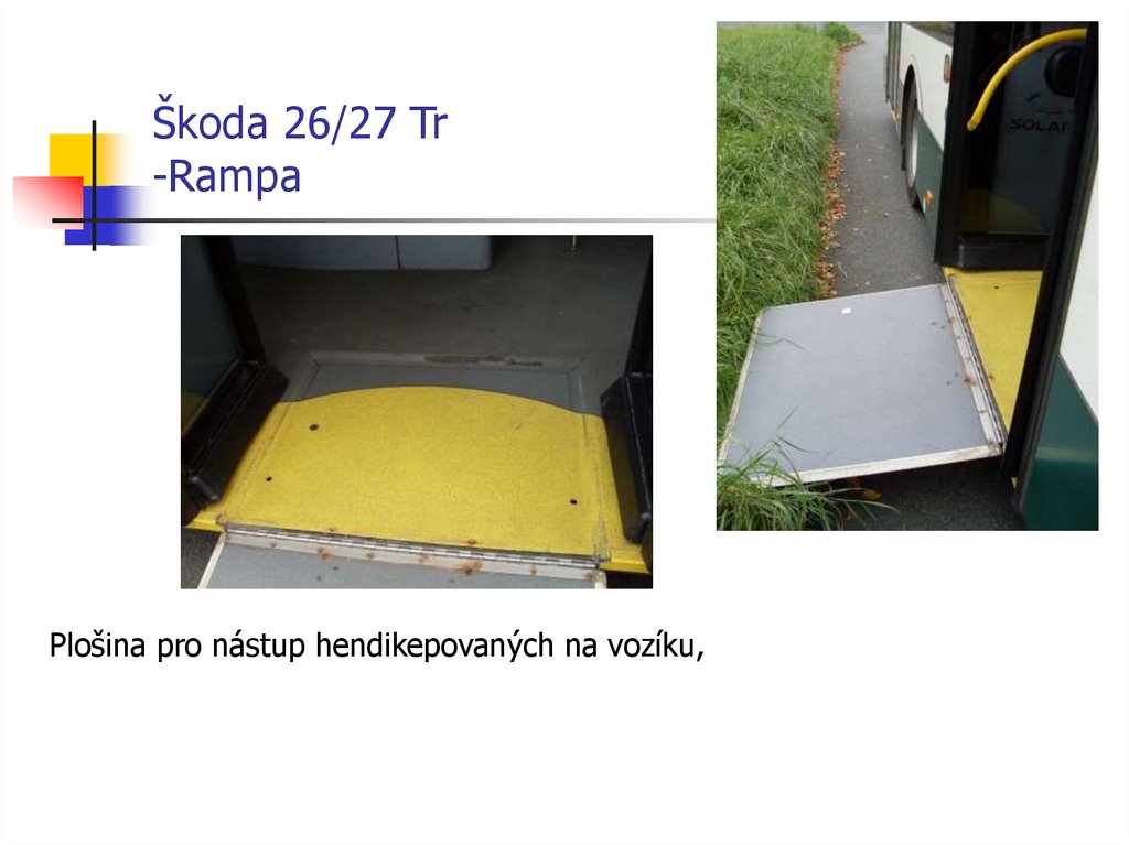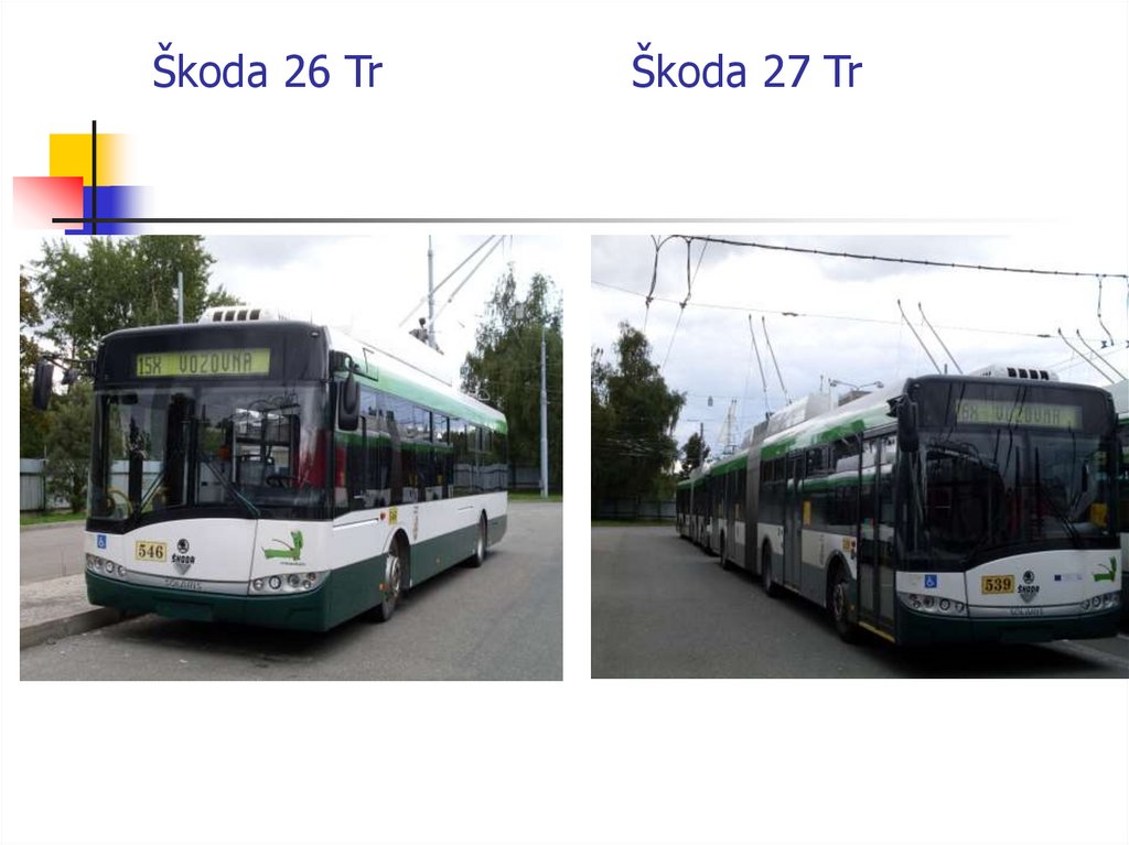 Trolejbus Škoda 27 Tr je kloubový, třínápravový, čtyřdvéřový, plněnízkopodlažní vůz, v druhých dveřích je vyklápěcí plošina pro