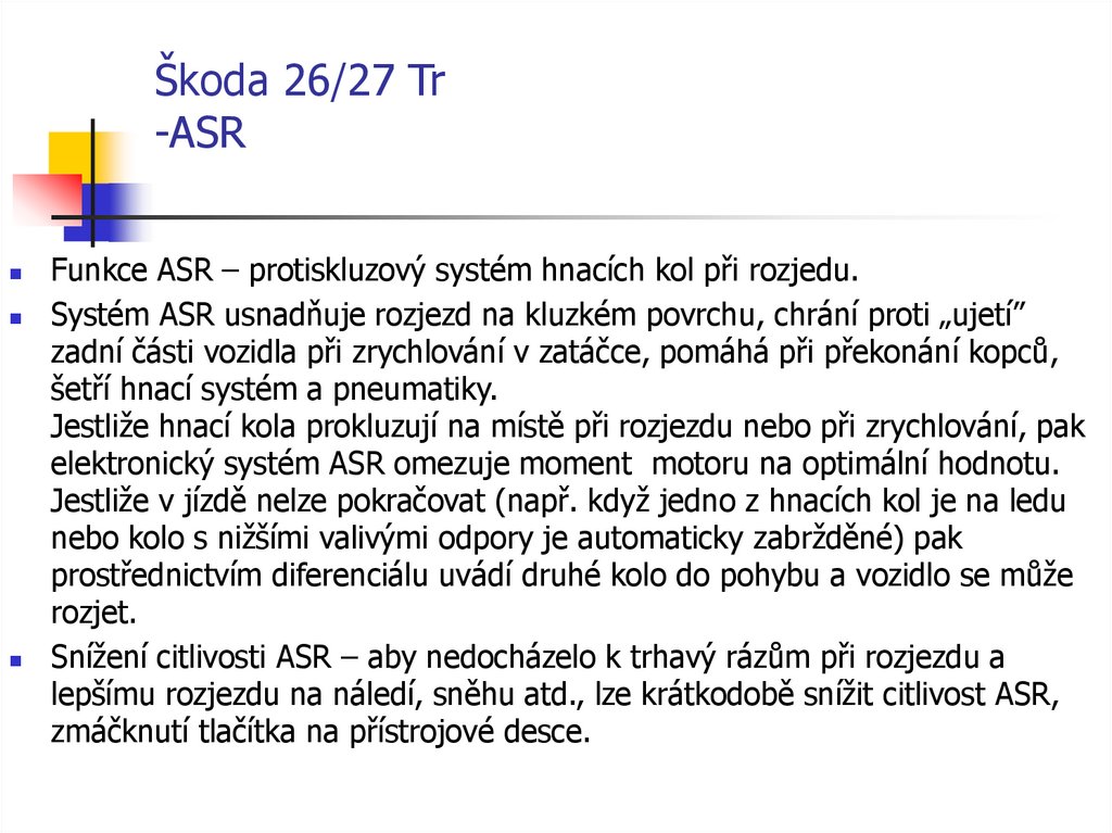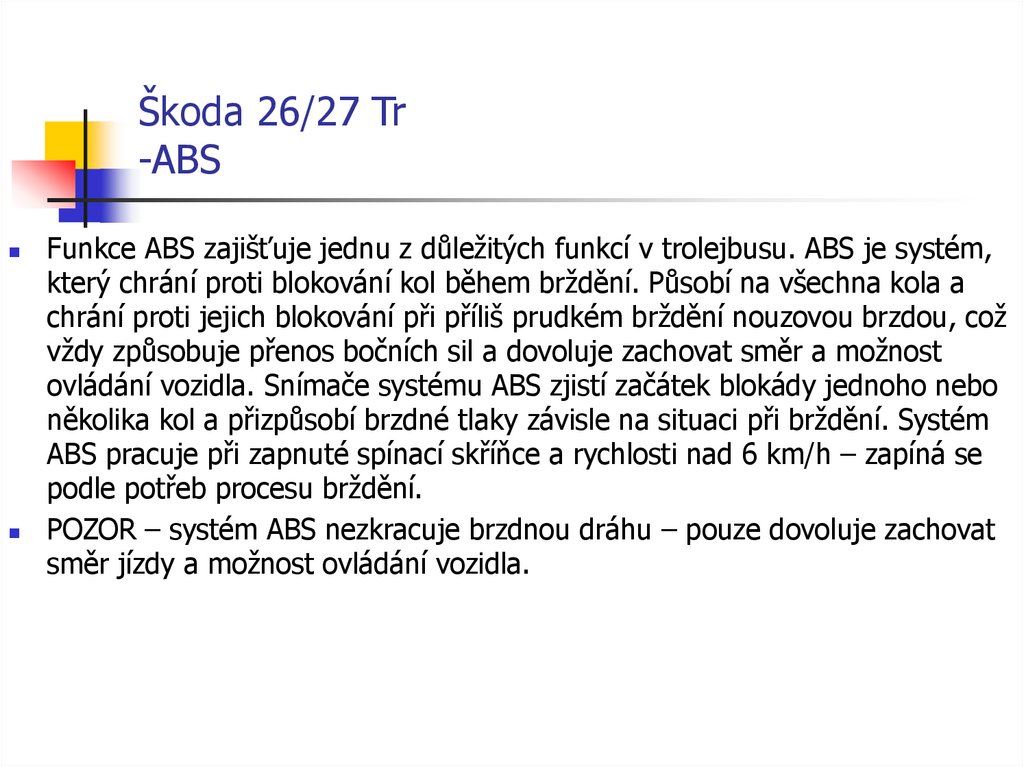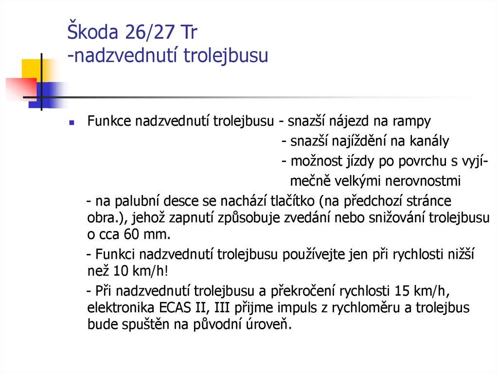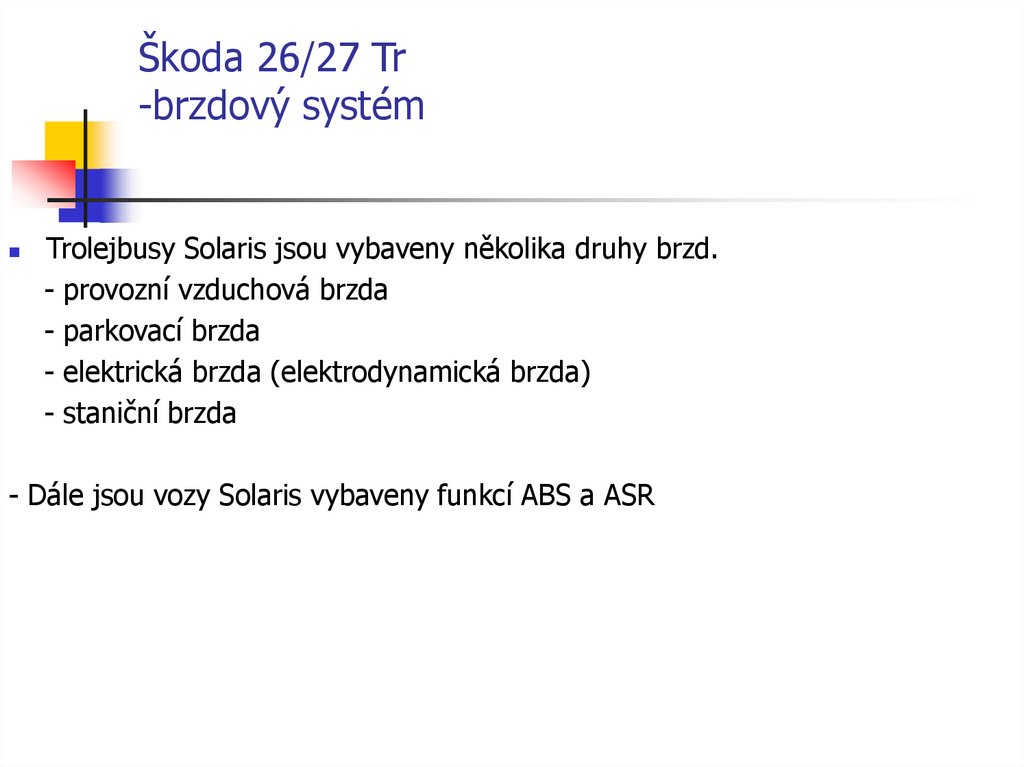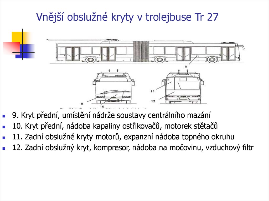 Trolejbus Škoda 27 Tr je kloubový, třínápravový, čtyřdvéřový, plněnízkopodlažní vůz, v druhých dveřích je vyklápěcí plošina pro