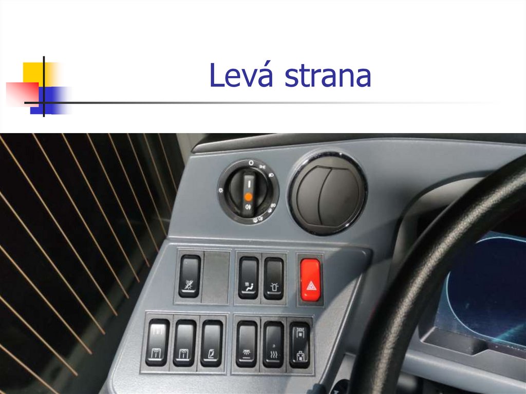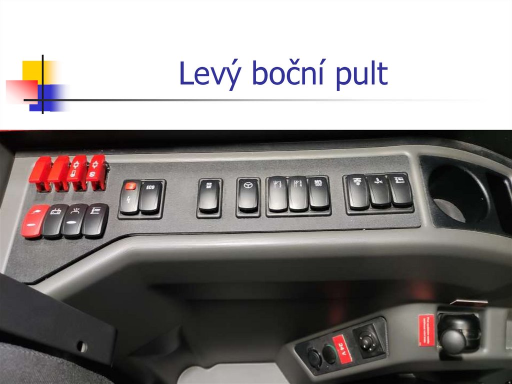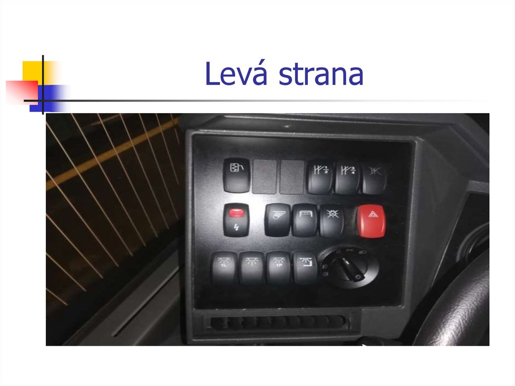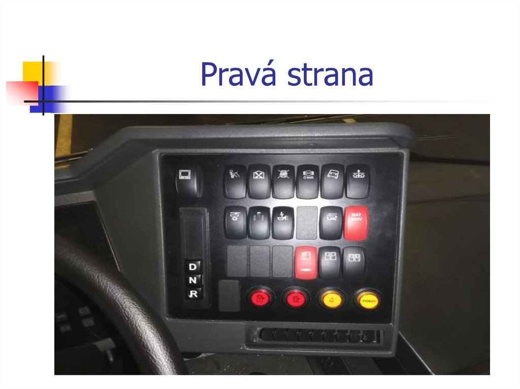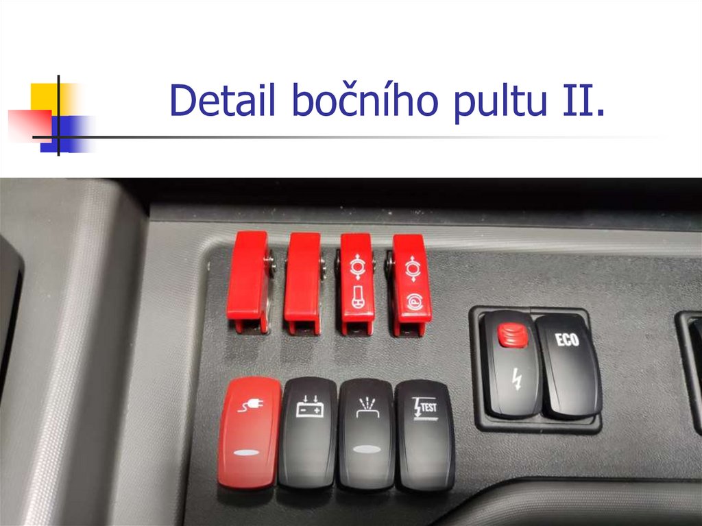 ruční brzda + zařazený neutral N, klíček 24V – spínač 600V – napájení sběračů – spínač nočního