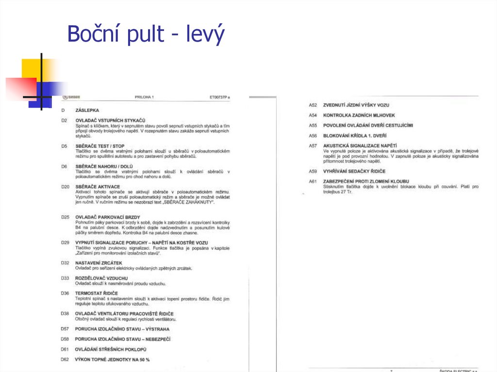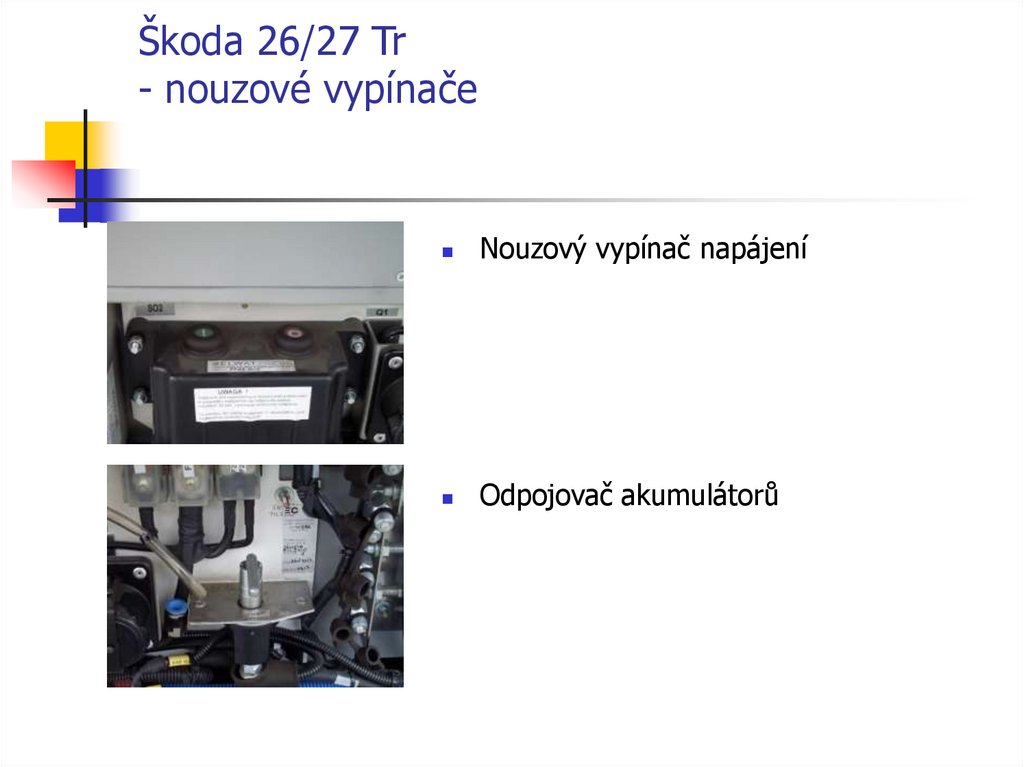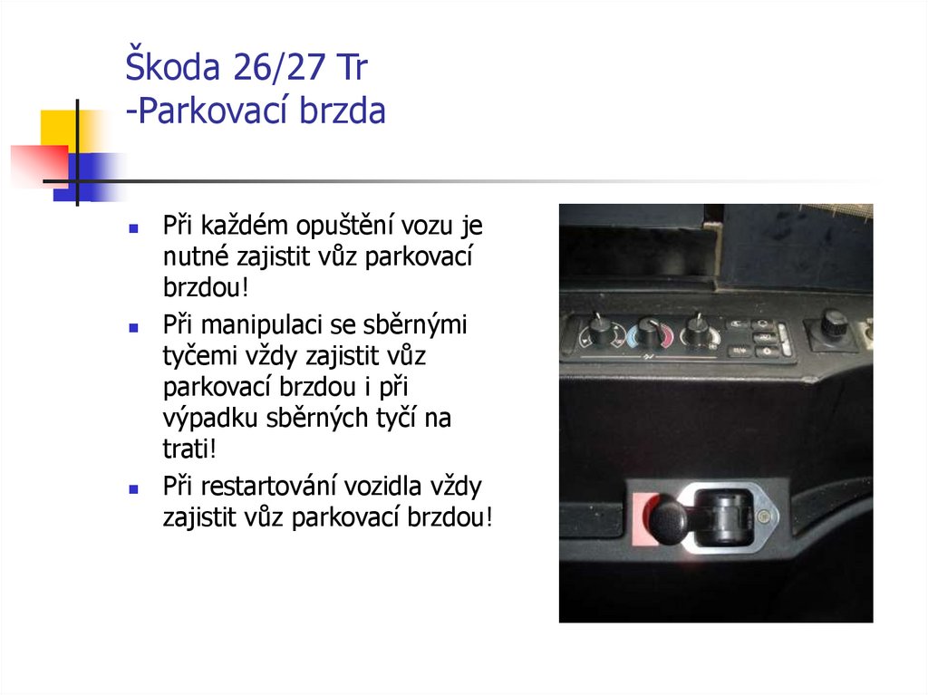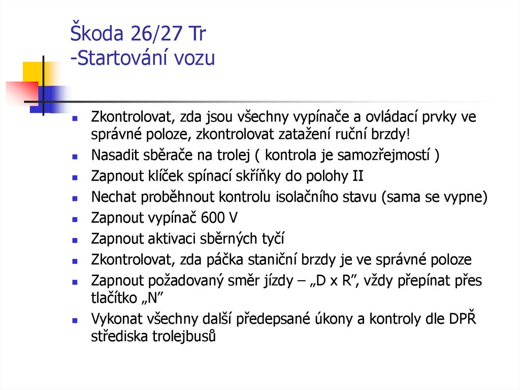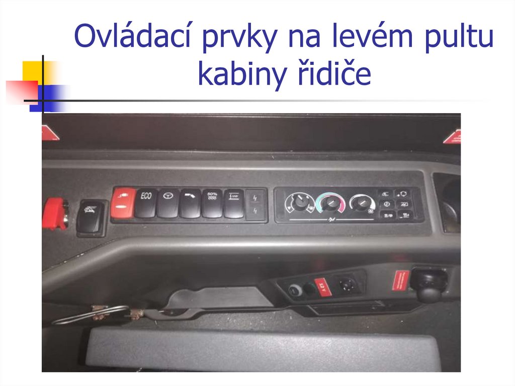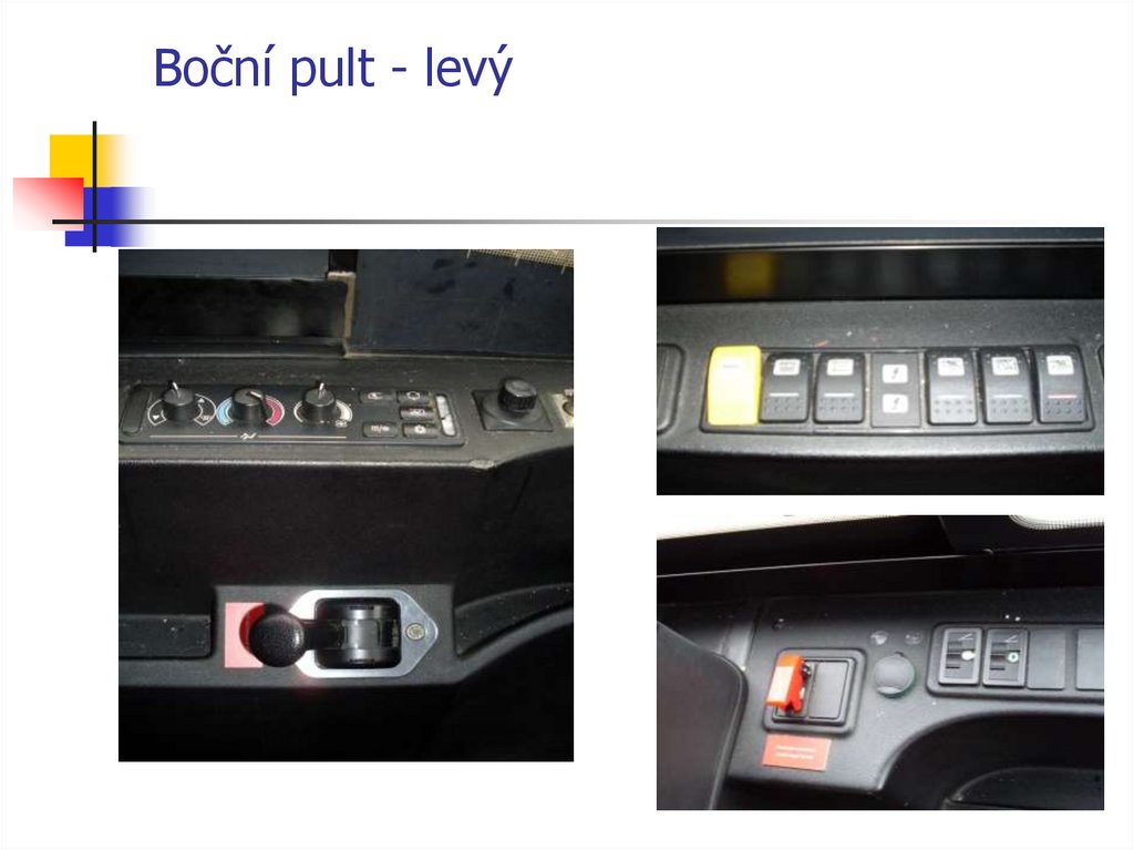 ruční brzda + zařazený neutral N, klíček 24V – spínač 600V – napájení sběračů – spínač nočního