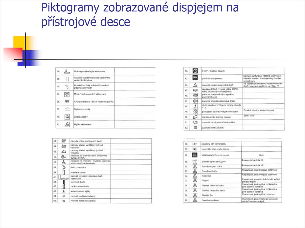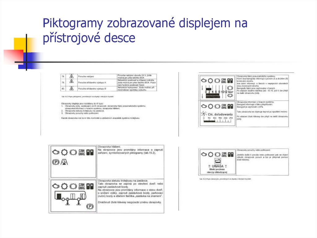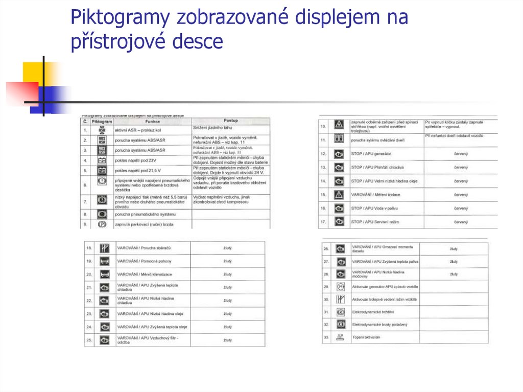 Piktogramy zobrazované dispjejem napřístrojové desce
