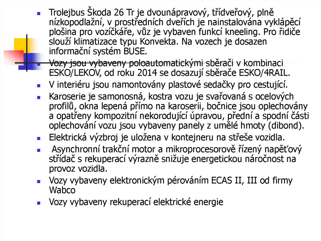 Trolejbus Škoda 26 Tr je dvounápravový, třídveřový, plněnízkopodlažní, v prostředních dveřích je nainstalována vyklápěcí