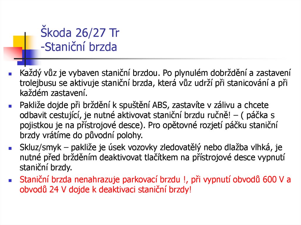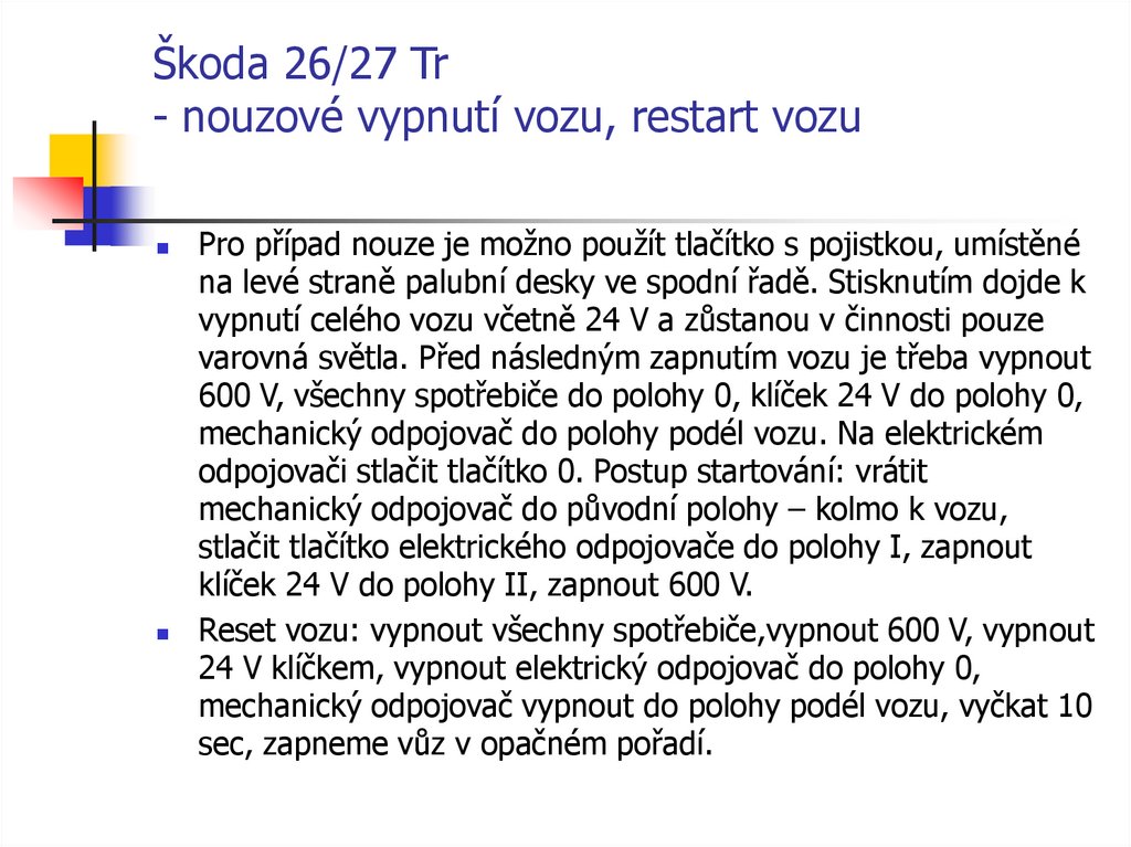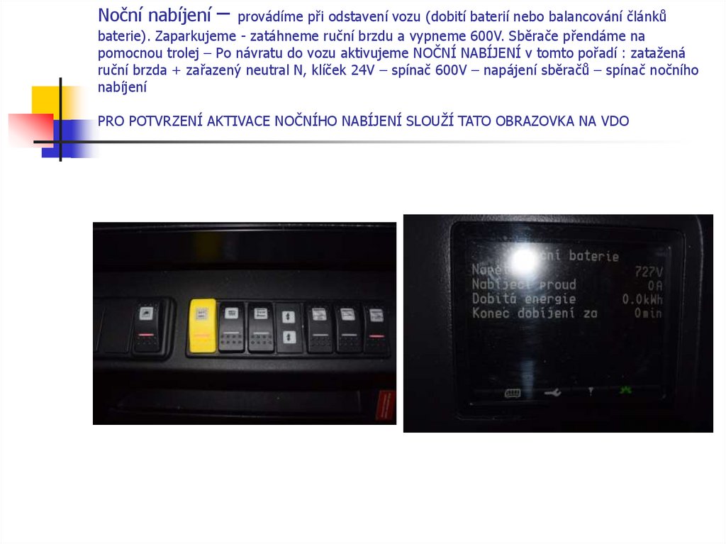 Noční nabíjení – provádíme při odstavení vozu (dobití baterií nebo balancování článkůbaterie). Zaparkujeme - zatáhneme ruční brzdu a vypneme 600V. Sběrače přendáme na