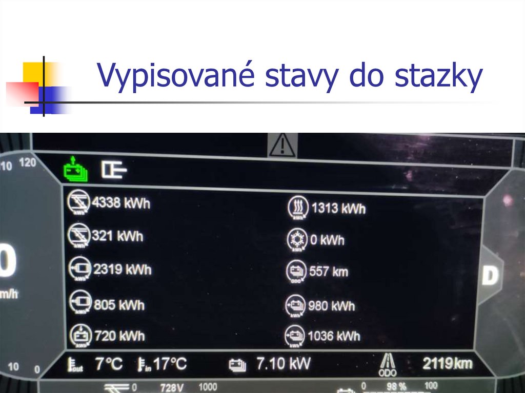V režimu jízdy na baterie je ponížen výkon topení na 50%, poslední piktogram zobrazuje stažené