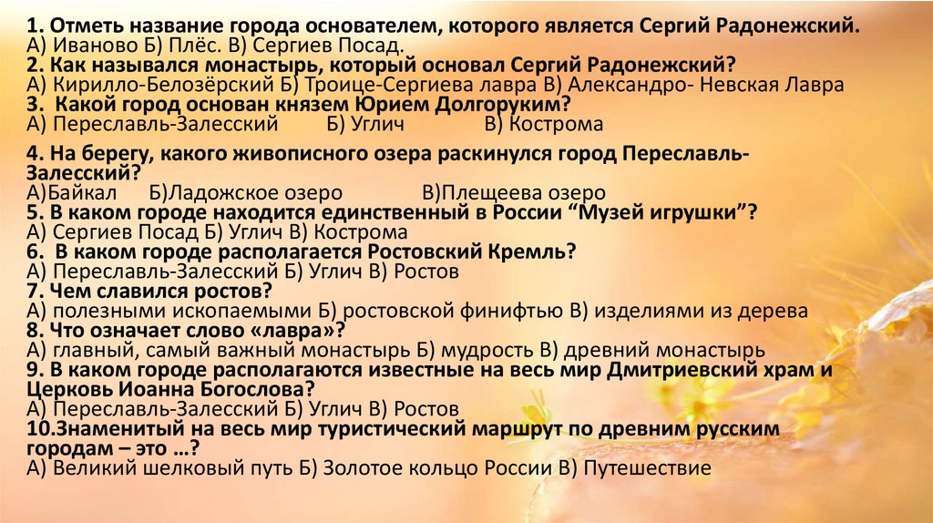 1. Отметь название города основателем, которого является Сергий Радонежский.А) Иваново Б) Плёс. В) Сергиев Посад.