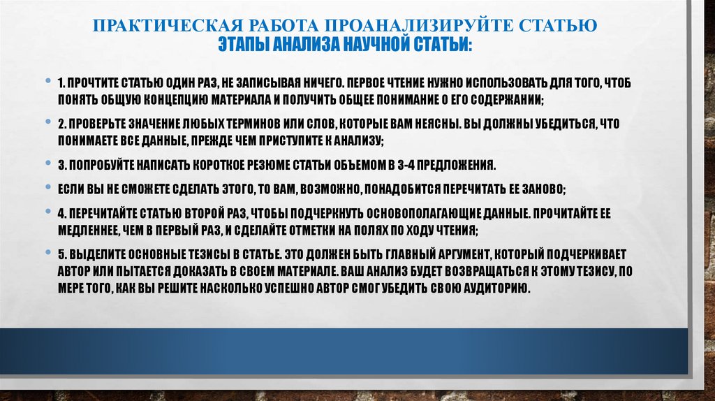 ПРАКТИЧЕСКАЯ РАБОТА ПРОАНАЛИЗИРУЙТЕ СТАТЬЮЭТАПЫ АНАЛИЗА НАУЧНОЙ СТАТЬИ: