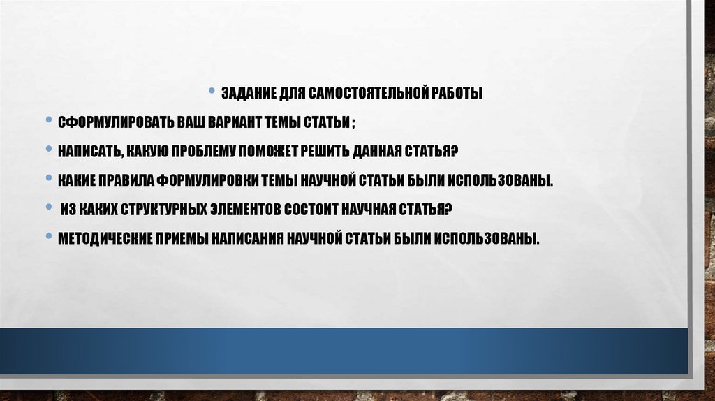 • ЗАДАНИЕ ДЛЯ САМОСТОЯТЕЛЬНОЙ РАБОТЫ• СФОРМУЛИРОВАТЬ ВАШ ВАРИАНТ ТЕМЫ СТАТЬИ ;