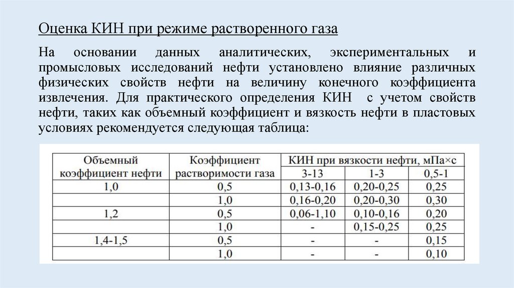 Оценка КИН при режиме растворенного газаНа основании данных аналитических, экспериментальных и