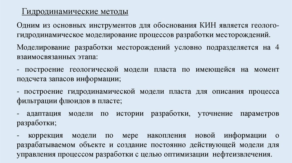 Гидродинамические методыОдним из основных инструментов для обоснования КИН является геологогидродинамическое моделирование процессов разработки месторождений.
