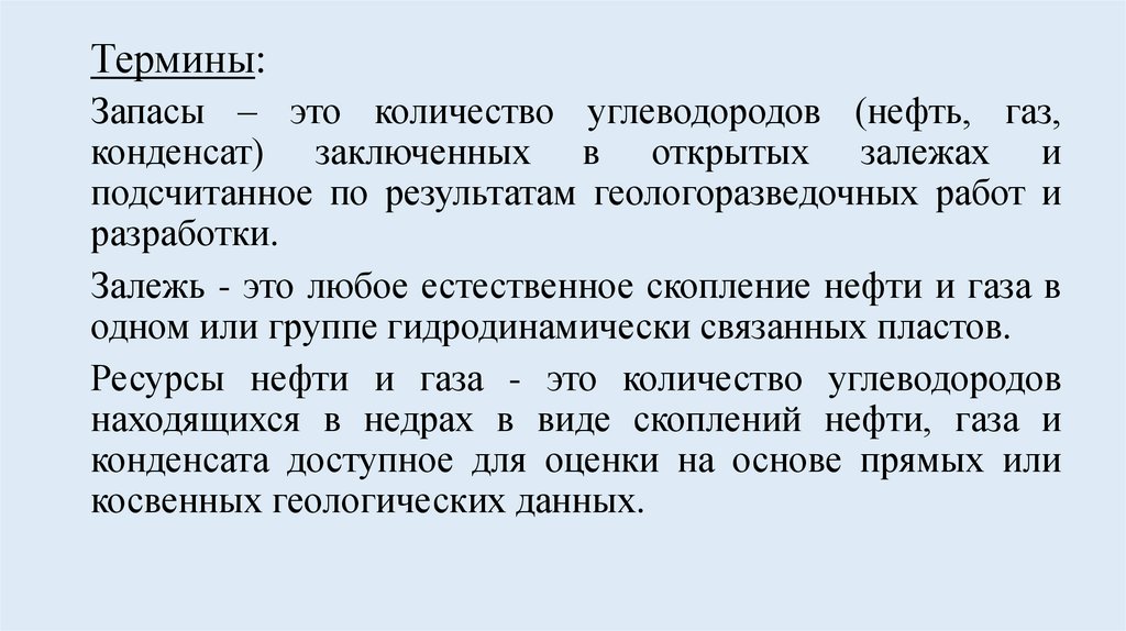 Термины:Запасы – это количество углеводородов (нефть, газ,