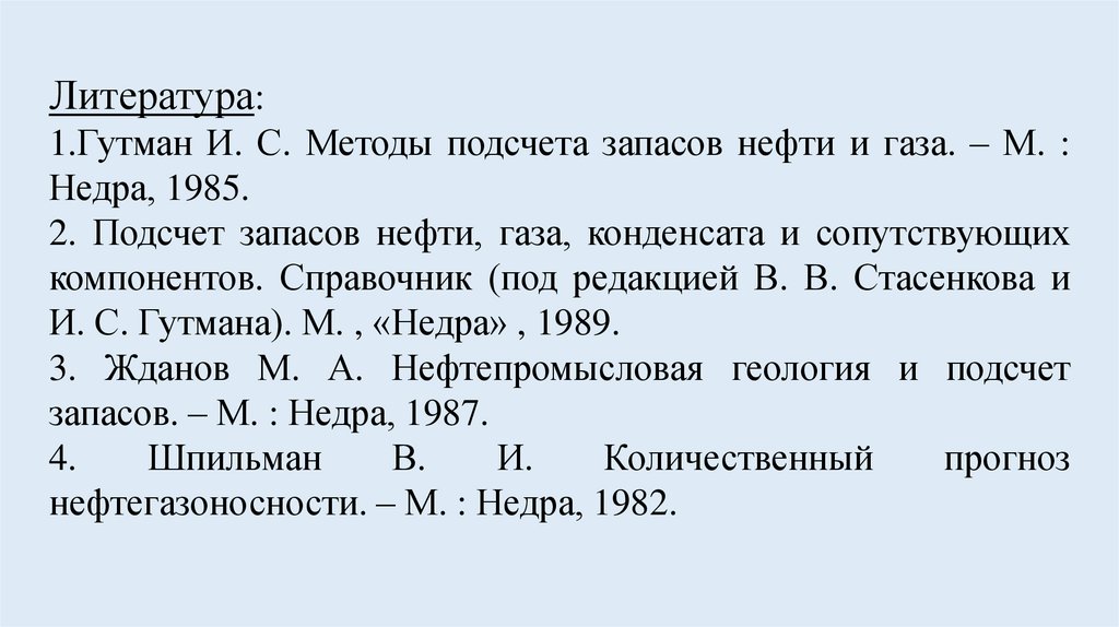 Литература:1.Гутман И. С. Методы подсчета запасов нефти и газа. – М. :
