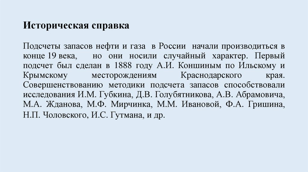 Историческая справкаПодсчеты запасов нефти и газа в России начали производиться в