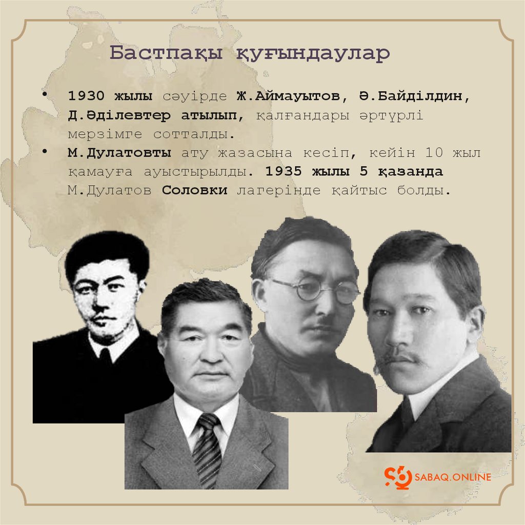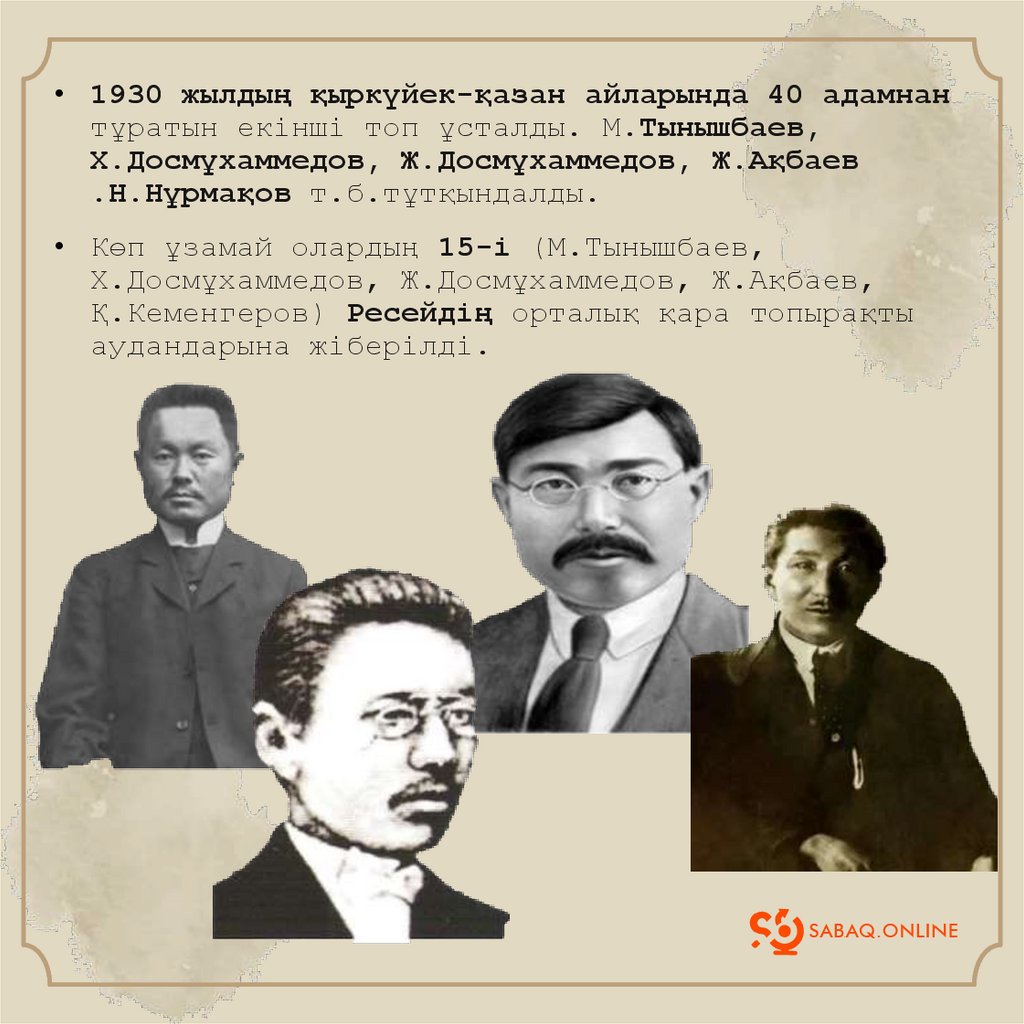 Бастпақы қуғындаулар1930 жылы сәуірде Ж.Аймауытов, Ә.Байділдин,