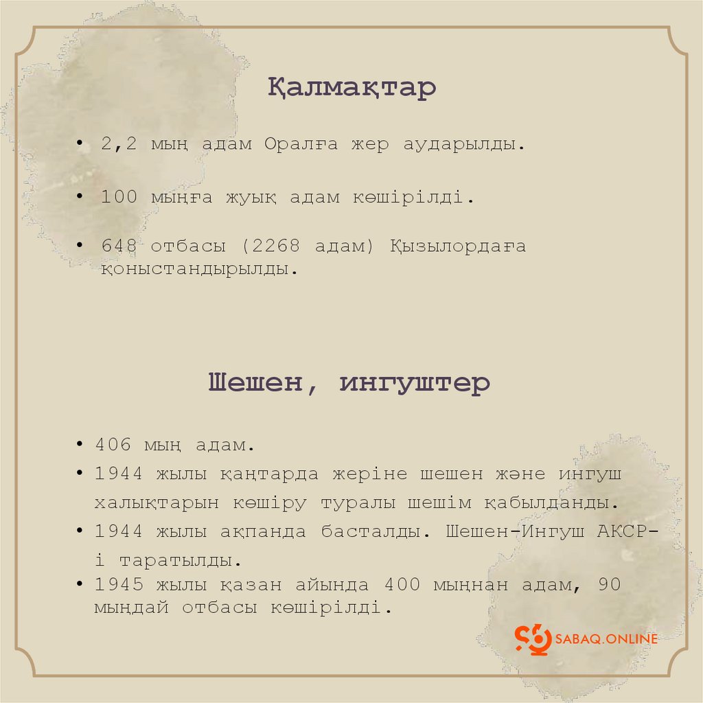 Қалмақтар• 2,2 мың адам Оралға жер аударылды.