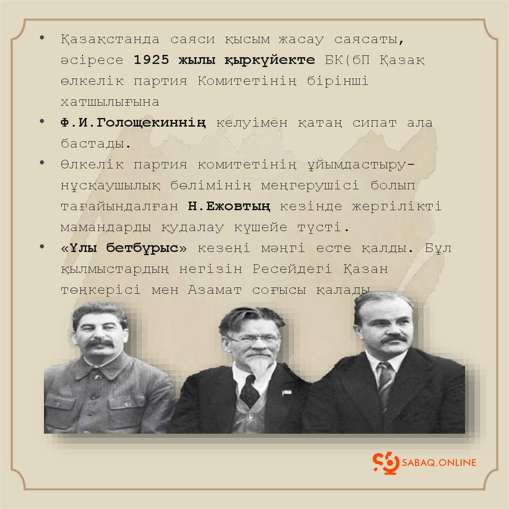 • Қазақстанда саяси қысым жасау саясаты,әсіресе 1925 жылы қыркүйекте БК(бП Қазақ
