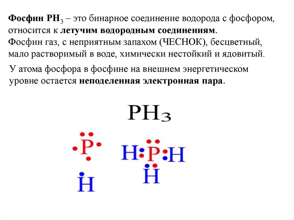 Фосфин PH3 – это бинарное соединение водорода с фосфором,относится к летучим водородным соединениям.